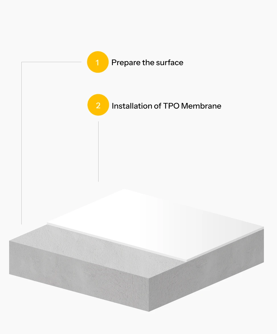 TPO membrane is a single-layer waterproofing system commonly used for large roof areas. It is designed to provide reliable waterproofing performance while reflecting heat and withstanding outdoor exposure.